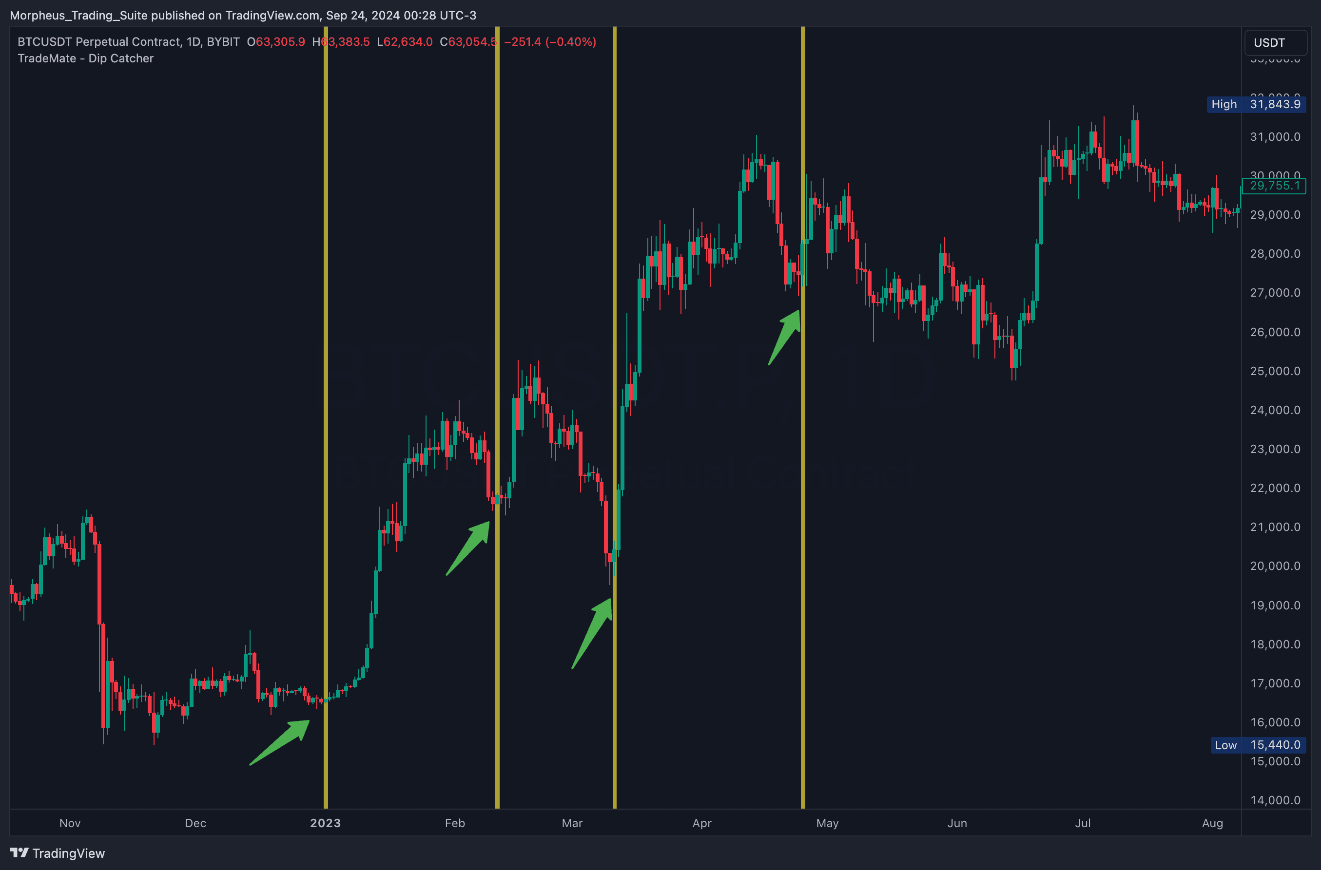 TradeMate - Dip Catcher specializes in identifying dips within uptrending markets. Using advanced algorithms, it provides precise long signals, enabling strategic entries and helping traders capitalize on bullish retracements with confidence and precision.