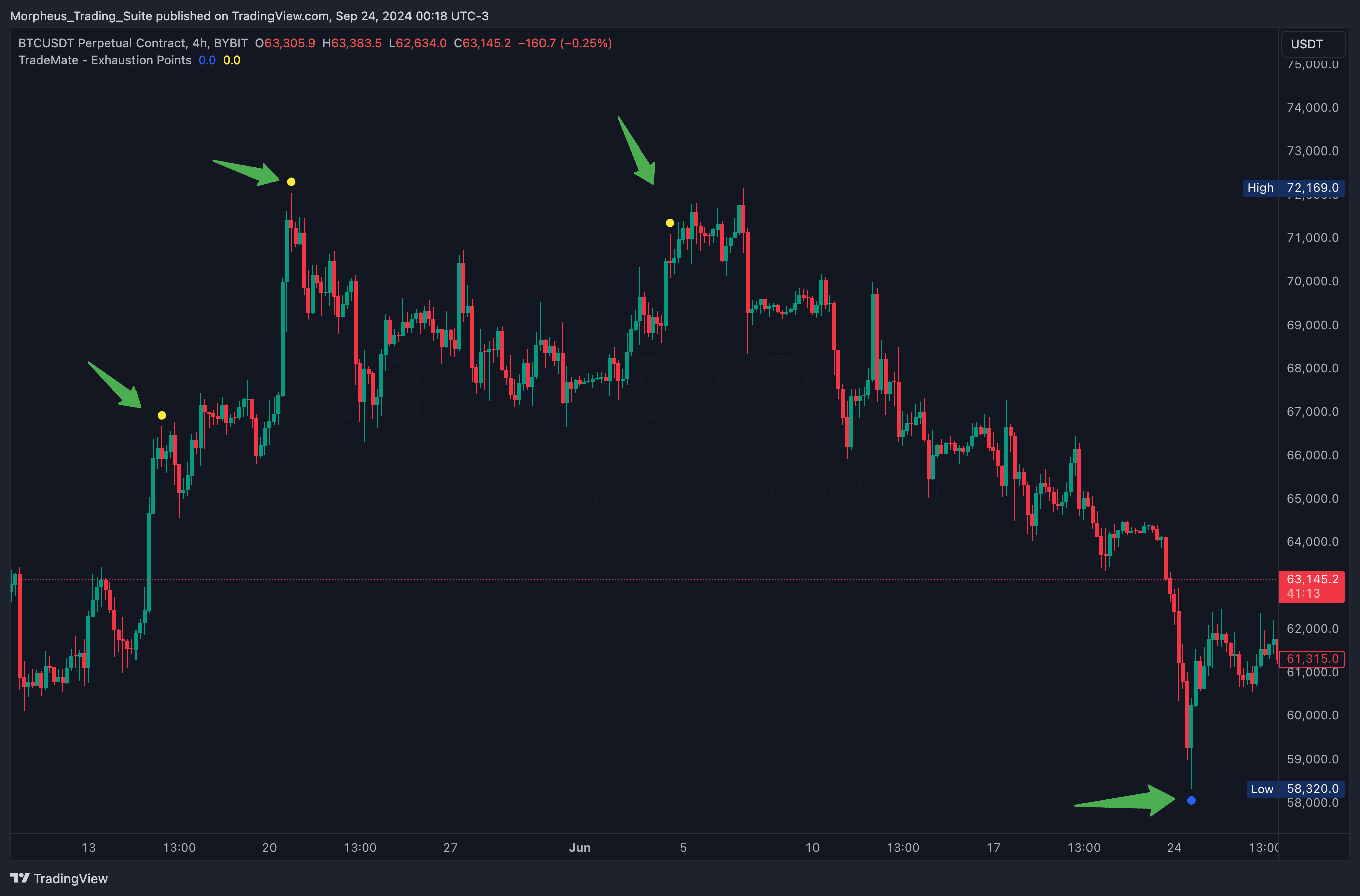 TradeMate - Exhaustion Points helps identify key moments when trends may lose momentum, using subtle chart markers. Though signals are less frequent, they provide valuable insights into potential reversals, adding precision to your strategy and helping you stay ahead of market shifts.