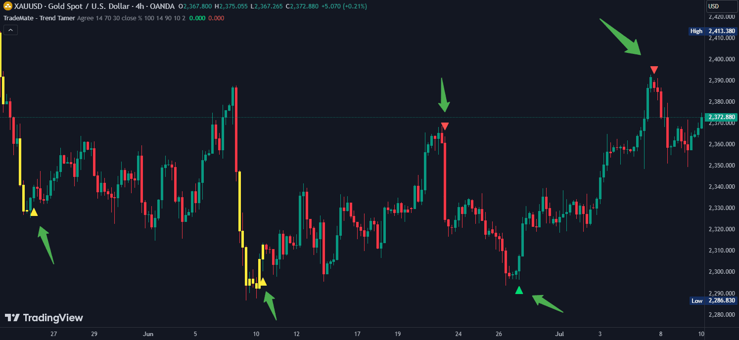 The TradeMate Trend Tamer is designed to help traders identify potential trend reversals and navigate periods of high market volatility. This tool combines a custom EMA-based oscillator with a volatility detection mechanism, providing traders with actionable signals that are easy to interpret and apply.